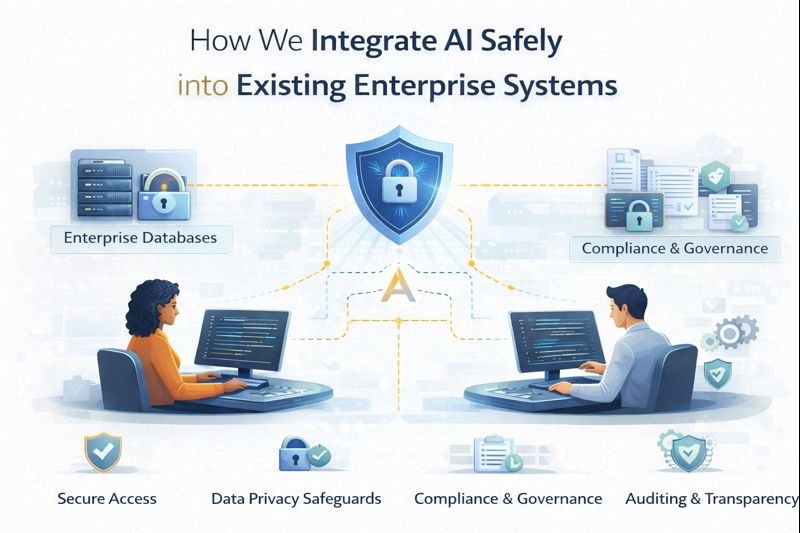 Enterprise AI success is not about flashy demos — it is about safe, compliant, controlled, and scalable integration. By embedding AI into existing systems responsibly, organizations unlock automation and intelligence without compromising stability or trust.